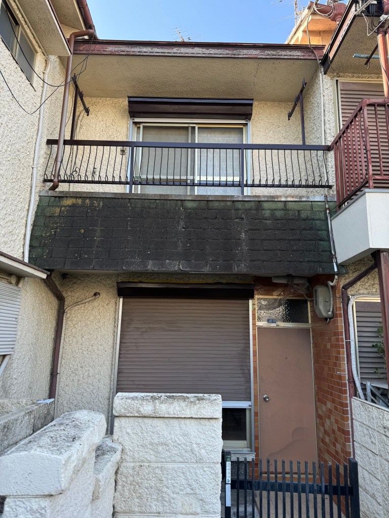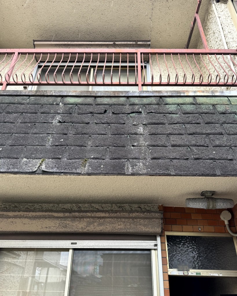 ベランダ下屋根 長年の風雨で劣化。見た目悪し。→葺き替え必要。。
